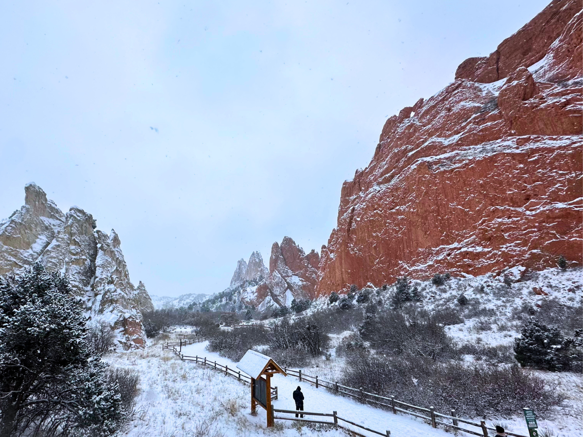 This route gives you breathless landscape views from around the inner garden loop with full sky views of the park and Pikes Peak—absolutely perfect for capturing the contrast between the red sandstone formations and early snow.