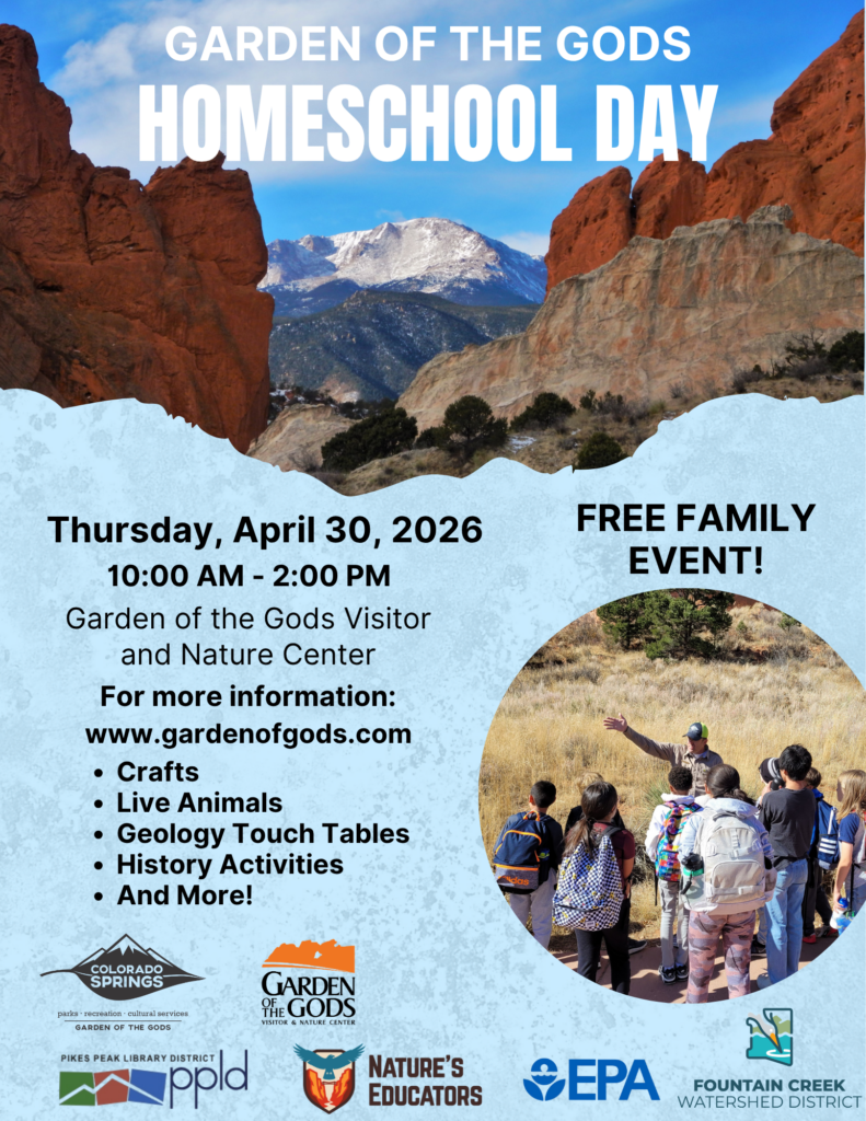 In order to offer bigger and better (or, at least different) educational possibilities for our visitors, this year we are hosting a Wonderful, Fantastic, Exciting Homeschool Day! On April 30th we invite all of our homeschool families (and lifelong learners) to explore the Garden of the Gods! Come into the Visitor and Nature Center to learn about Colorado’s wildlife with live animals from Nature’s Educators, sit in on presentations about the Garden, and explore our hands-on exploration stations to discover more about our local geology, ecology, and human history! After, grab a snack from the café and head into the park for a self-guided hike through the central garden. This event is designed to be a choose-your-own-adventure day, where families can personalize their learning experience based on their own needs and interests.
